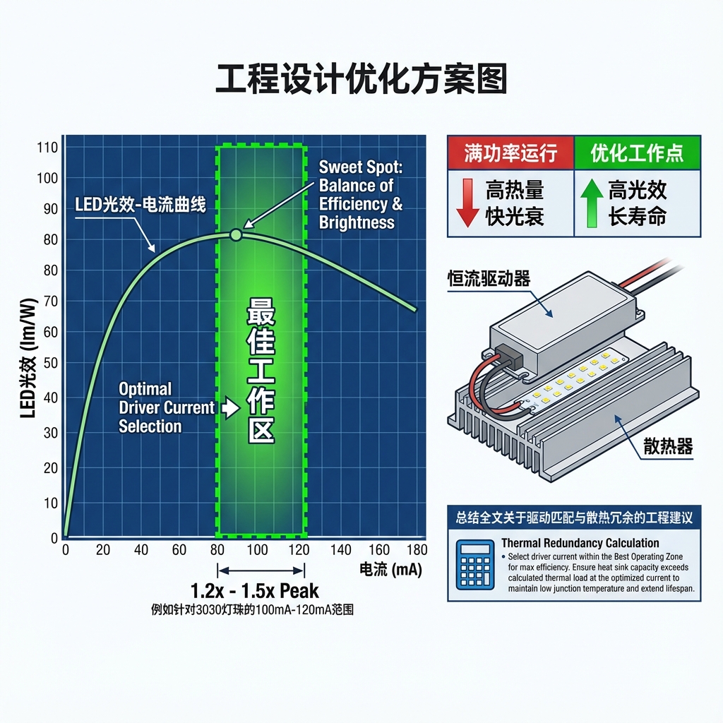 建议根据LED光效曲线,选择光效峰值电流的1.2到1.5倍作为工作点。例如,如果一颗3030灯珠在60mA时光效最高,在150mA时亮度最大,那么设计在100mA-120mA通常是兼顾亮度、寿命和成本的最佳选择。