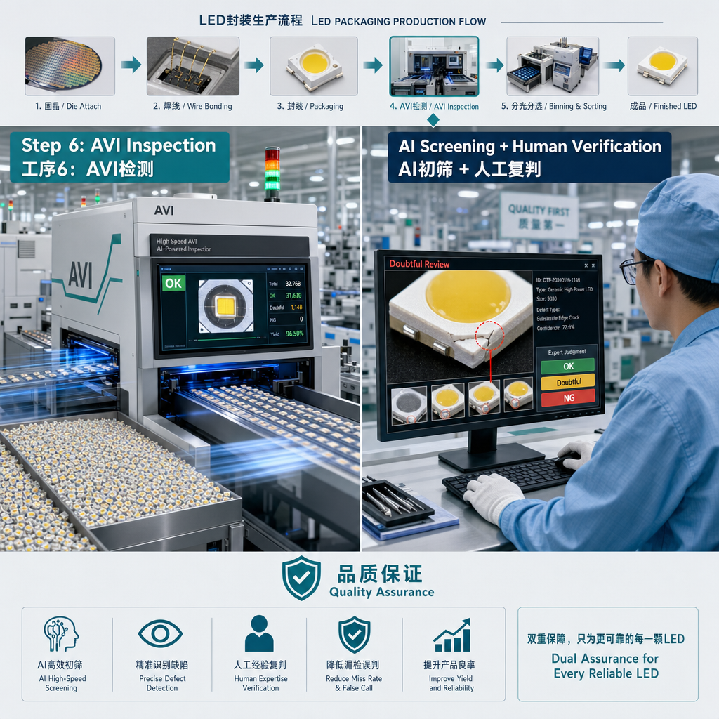做LED颗粒时,最怕的不是“大故障”,而是肉眼不易稳定发现的小缺陷:偏位、污染、断线、胶裂。这就是很多人反复追问led颗粒生产过程中的avi工序是什么意思的原因。简单说,AVI就是自动视觉检测,用于在量产中快速筛出外观和封装异常,减少漏检并稳定出货品质。