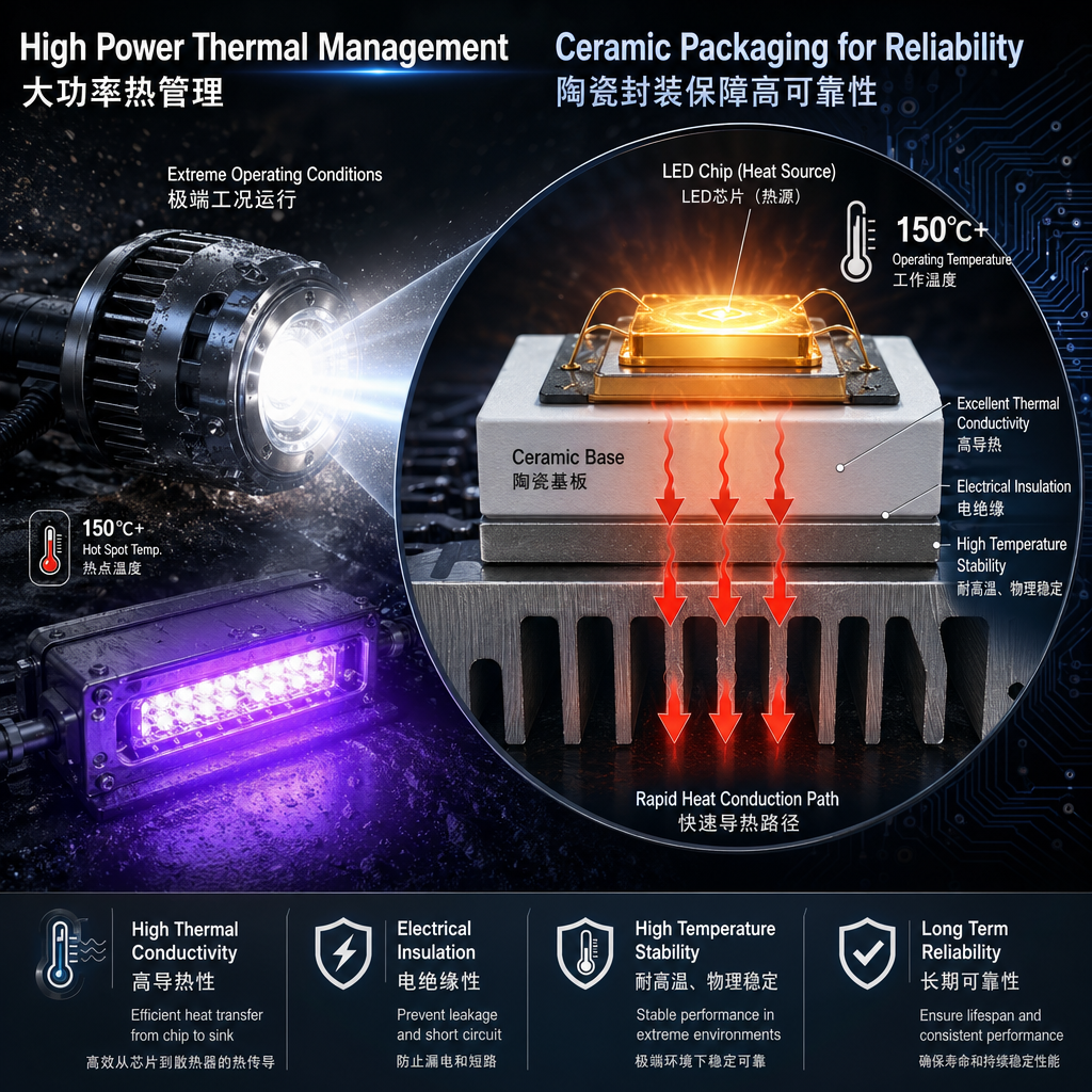 比如一个汽车照明或 UV 光源项目,工程师通常最先看到的是 高温、长时间工作、高电流驱动 这几个要求。此时方案里往往会写 陶瓷封装,因为它对热管理和结构稳定性更有帮助。